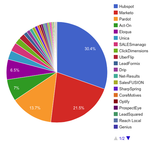 This list is in-line with industry reporting — Hubspot is far and away the most popular choice for startups, while Marketo, Pardot, and Eloqua are each favored by a different segment of mid-to-large companies.