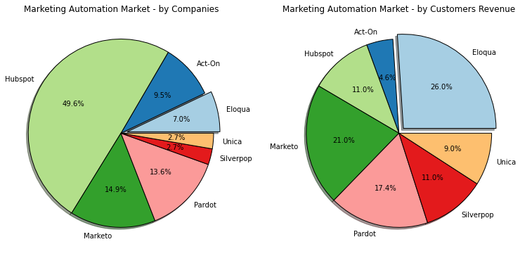It should be noted that the ranking for top 7 marketing automation companies by actual customer revenue looks very different. Eloqua is the leader in Enterprise Marketing Automation and the company with the most revenue — and Hubspot doesn’t even fall into the top 3. But this is hardly surprising when you compare monthly subscription rates.